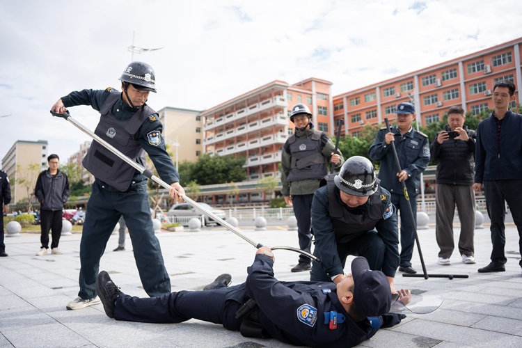 随后,在民警的指导下,学校保卫干部和安保人员按照规范流程进行了一对一、二对一、三对一的技能训练和实战演练。整个演练过程针对性强,紧凑有序。