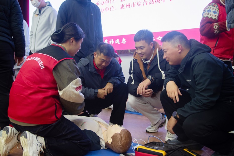 “如何把握黄金四分钟?”“遇到异物卡喉怎么办?”活动现场,来自惠州市急救技能宣讲团的专业讲师通过多媒体PPT演示、视频教学、案例分析和现场互动等形式,系统全面地讲解了心肺复苏术、海姆立克急救法、AED使用等急救知识和应急措施。