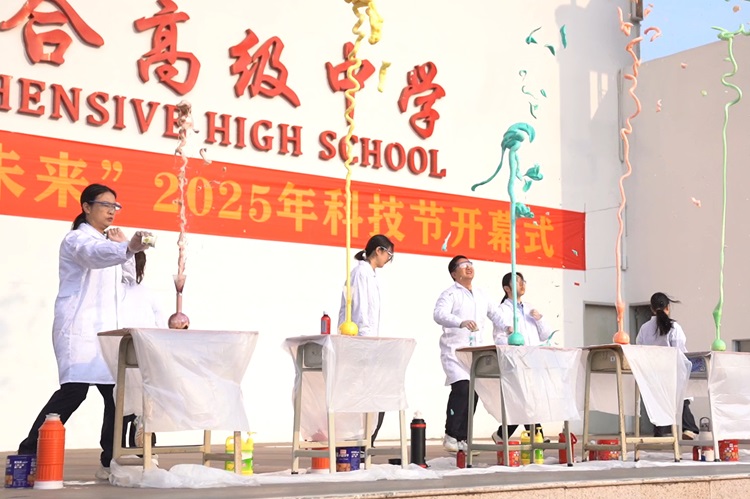 科技项目展示环节精彩纷呈。物理科组和化学科组的老师们带来了多个趣味实验,让同学们近距离感受科学的魅力。