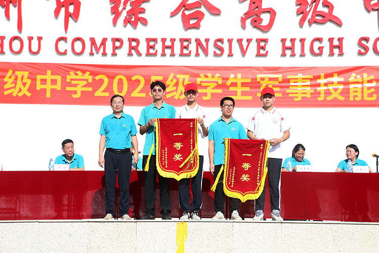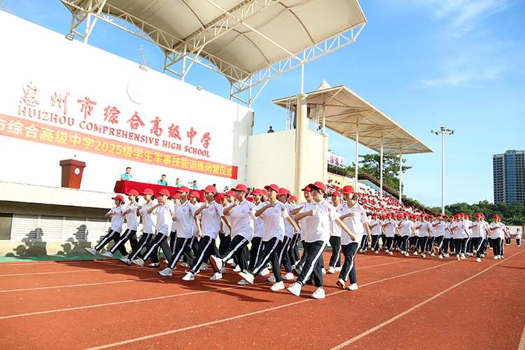 最后,侯宏泉总校长代表学校向承训单位惠城区人民武装部赠送锦旗,表达诚挚谢意,并宣布惠州综合高中2025级高一新生军训闭营。