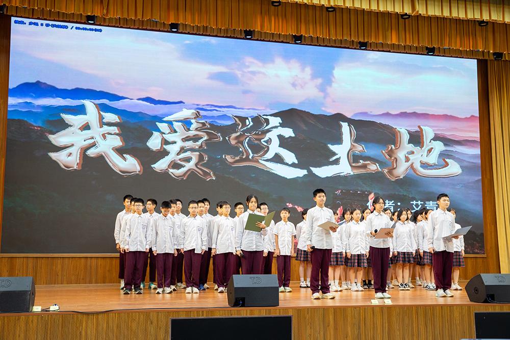 “为什么我的眼里常含泪水?因为我对这土地爱得深沉……”朗诵表演《我爱这土地》以铿锵之声传递出学子对祖国炽热而深沉的情感,引发强烈共鸣。